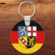 Button Keychain with flag of Saarland; design with horizontal tricolor of black, red and yellow (golden), with state’s coat of arms in the center