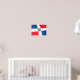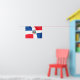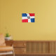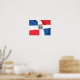 The flag of the Dominican Republic, as described by Article 96 of the Dominican Constitution, features a centered white cross that extends to the edges and divides the flag into four rectangles—the top ones are blue (hoist side) and red, and the bottom ones are red (hoist side) and blue. A large coat of arms featuring a shield with the flag design and supported by a bay laurel branch (left) and a palm frond (right) is at the center of the cross; above the shield, a blue ribbon displays the national motto: Dios, Patria, Libertad (God, Fatherland, Liberty). Below the shield, the words República Dominicana appear on a red ribbon (this red ribbon is depicted in more recent versions as having its tips pointing upward). In the center of the shield, flanked by three spears (two of them holding Dominican banners) on each side, is a Bible with a small cross above it and said to be opened to the Gospel of John, either to chapter one or chapter 8, verse 32, which reads Y la verdad nos hará libre (And the truth shall make you free). The blue on the flag stands for liberty, the white for salvation, the red for the blood of heroes. The civil ensign follows the same design, but without the charge in the center.