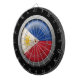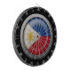 Dieses einzigartige grafische Eigenschaften die Flagge des Philippinen-Sets innerhalb eines Kreismetallrahmens. Die philippinische Flagge hat den Auftritt des Seins unter einem Stück Glas mit einer hellen Reflexion, die an der Spitze des Entwurfs sichtbar ist. Die Flagge hat eine raue addierte Beschaffenheit, die das glatte Ende des Edelstahlrahmens kontrastiert. Dieses Kreisflaggenmuster ist eine stilvolle Weise, Ihren Patriotismus vorzuführen.