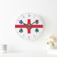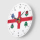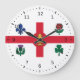 Uhr mit der Flagge von Montreal, der bevölkerungsreichsten Stadt in der Provinz Quebec, Kanada. Eine weiße Fahne mit rotem Kreuz, eine weiße Kiefer, eine blaue Fleur-de-lys, eine rote Rose Lancaster, ein Kleeblatt und eine Diele