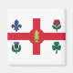 Magnet mit der Flagge von Montreal, die bevölkerungsreichste Stadt in der Provinz Quebec, Kanada. Eine weiße Fahne mit rotem Kreuz, eine weiße Kiefer, eine blaue Fleur-de-lys, eine rote Rose Lancaster, ein Kleeblatt und eine Diele