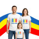 Abgeschiedene pixelförmige Flagge Rumäniens mit Text: Blau. Gelb. Rot. Für immer rumänisch