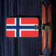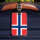 Die Flagge von Norwegen ist mit einem skandinavischen Kreuz des Indigoblaus rot, das im Weiß umrissen wird, das auf die Ränder der Flagge verlängert; das vertikale Teil des Kreuzes wird auf die Hebemaschinenseite im Stil des Dannebrog, die Flagge von Dänemark verschoben.