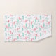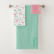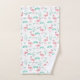Les serviettes de toilette flamingo roses étaient soigneusement empilées sur une surface grise. L'ensemble de serviettes de bain assorties était recouvert de flamants roses brillants. La surface rouge a fait ressortir les flamants roses.