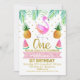 Flamant rose tropical Premier anniversaire Invitation Cute flamingo première invitation d'anniversaire avec une douce aquarelle flamingo, un peu de feuillage, des tranches de pastèque et des ananas. Le titre est une fausse texture de feuille d'or et ne peut pas être modifié. La conception de l'invitation pour le premier anniversaire de cette mignonne fille est sûr de préparer le décor pour la prochaine fête d'anniversaire de votre petite fille. D'autres articles de cette conception sont disponibles au magasin.