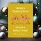 Carte de voeux de Noël tropical avec flamants et texte personnalisé. Les cartes à plat bleu Aqua ont quatre flamants roses debout parmi les petites étoiles de mer. Ils portent des hibiscus festifs et des couronnes saintes. Une fine bordure rose coupe la carte 5x7 et toutes les lignes de texte sont faciles à modifier ou à supprimer. L'exemple indique : "Mers et salutations pour un Joyeux Noël et Bonne Année" avec la signature en bas. L'inverse est rose solide. Parfait pour envoyer d'une famille ou d'un groupe dans un endroit tropical.