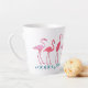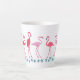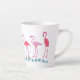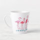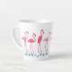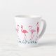 Tropische Flamingos Latte Tasse für eine Küstenküche. Rosa Flamingos stehen unter kleinen blauen Seestern auf weißen Tasse in zwei Größen.