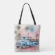 Wasserfarbenflamingo im Retro-blauen LKW mit Palmen.