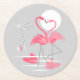 Ein Paar rosa Flamingos mit geschwungenen Halsbändern, die eine Herzform bilden, stehen auf einem mondbeleuchteten Strand im Meer. Stilvolles, romantisches Design mit Retro-Touch in rosa, grauen und weißen Farbtönen mit Farbwechsel. Ein individuell anpassbares Design für Sie, um mit Ihrem eigenen Text, Bildern und Ideen zu personalisieren. Ein originelles digitales Kunstbild.