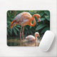 Eine lebendige Szene mit einem hohen Flamingo, das neben seinem Kick stehend ist, während es im Wasser eintaucht, umgeben von üppigem Grün.