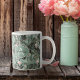 Die Tasse ist mit einem prächtigen Flamingos-Muster versehen, umgeben von üppigem tropischem Blattwerk und Orchideen in Salbeigrün und Rosa. Es wurde ein Etikett zur Aufbewahrung Ihres Namens und Monogrammes oder eines anderen Textes bereitgestellt. Suchen Sie ID868 um weitere Produkte mit diesem coolen, tropischen Muster zu sehen.