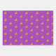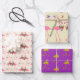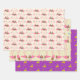 Drei Blätter tropischer Weihnachtsverpackung mit Flamingos. "Seas and Greetings" mit ein paar Vögeln, die in Ferienkränzen verdeckt sind, ist das Design auf dem ersten Blatt. Ein größeres, spiegelndes Flamingo-Design, mit Meersternen, bedeckt das zweite Blatt Papier. Auf dem dritten Stück bilden Goldflamingos ein Muster über lila Farben.