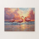 Ein lebendiges Trio von Flamingos Spaziergängen entlang des Sandstrandes, ihre leuchtend rosa Federn kontrastieren wunderbar mit der sanften Ozeankulisse. Diese lebhafte und tropische Szene erinnert an den sorgenlosen Geist der Ruhe im Sommer und am Strand.