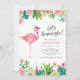 Lassen Sie Ihre Gäste mit dieser lustigen Flamingo- und Tropenblumeneinladung mit einem gestreiften Hintergrund in Ihr Brautparty einladen.