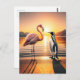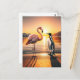Eine surreale Szene, die einen Flamingo und Pinguin nebeneinander aufnimmt und bei Sonnenuntergang lange Schatten auf einem schimmernden Ufer wirft.