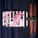 Die Produktgestaltung umfasst einen Flamingo mit kaleidoskopischen Paisley-Mustern in Rosa über schwarz-weißem Streifen Hintergrund. Dieses tropische Vogeldesign mit personalisiertem Text macht aus einem modernen und einzigartigen Gepäckanhänger.