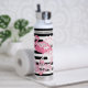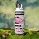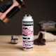 Die Produktgestaltung umfasst einen Flamingo mit kaleidoskopischen Paisley-Mustern in Rosa über schwarz-weißem Streifen Hintergrund. Dieses tropische Vogeldesign mit personalisiertem Text macht eine moderne und einzigartige Wasserflasche.