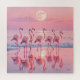 Rosa Flamingos stehen anmutig an einem Strand, der sich im ruhigen Wasser widerspiegelt, während sich ein rosa Mond im Pastellhimmel erhebt