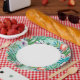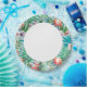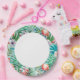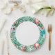 9" runde Teller für jeden Anlass. Farbenfrohe Flamingos und Palmenfronddruck. Türkisgrün, Blau und lila. Koordiniert mit Luau Party Collection.
