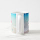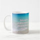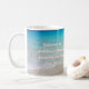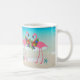 Zwei Flamingos an der Tasse. "Willkommen zu [hier] Zuhause am Meer" und Datum festgelegt - ist der Beispieltext auf dieser Tasse der Beachszene. Rosa Flamingos, in Kränzen gekleidet und unter Seestern stehend, stehen sich in diesem Design gegenüber. Fett formatierter, blauer Skripttext kann mit allen Nachrichten, Namen, Daten usw. personalisiert werden, die Sie auswählen.