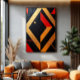 Energetische geometrische Abstraktion! Diamanten und Dreiecke in Schwarz, Gold und intensiv Rot, mit Texturen, die Tiefe verleihen. Eine visuelle Explosion, die mathematische Strenge und chromatische Leidenschaft verbindet - ideal für moderne Kunstliebhaber, die mutige Kontraste suchen.