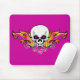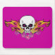 Der Schädel mit Reißzähnen und Flammen und rosa gürtelige Herzen.