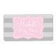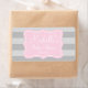 Die Personalisierte, elegante Aufklebervorlage mit gestreiftem Hintergrund und Klammer-Form ist in Pink und Grau gehalten. Stilvolle Skripttypografie für den Namen und das Geburtsdatum des Mädchens. Verwenden Sie als klassische Tischdekoration oder danken Sie für die Gäste des Party.