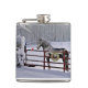 Une scène de neige en hiver paisible avec un cheval dans le pâturage, et une cardinale rouge vif et une couronne sur la porte.