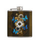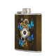 Composition de l'horloge à vapeur ronde avec cadran numérique romain noir, décorée de lances dorées et en laiton, papillons Morpho bleus et lentilles endommagées sur arrière - plan rayé brun. Style Steampunk.