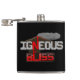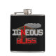 Ce flacon de hanche humour géologie présente le jeu de mots "Igneous is Bliss", une géologie qui tourne autour de l'expression commune "Ignorance is Bliss". Les lettres sont dessinées sous la forme de roches grises et de mousses de magma rouge, cristallines, sous un volcan actif en éruption.