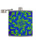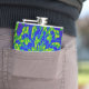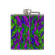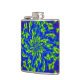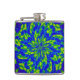 Cette fiole de hanche colorée présente un mandala circulaire abstrait sauvage, motif de verts et de bleus lumineux, tourbillonnant autour d'une fleur centrale. Les tourbillons violets et magenta sont à l'arrière.