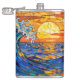 A flask with an illustration of a stained glass mosaic ocean waves and sunset illustration.