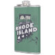 Hip flask features a retro style scenic Rhode Island vignette in a state shaped silhouette.
