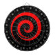 La conception en spirale sauvage couvre cette planche de fléchettes de régulation ainsi qu'une bordure latérale étoilée. spirale noire sur un rouge vif