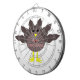 Cette superbe planche de fléchettes présente un dessin d'une dinde aux grands yeux noirs, un petit bec jaune et des plumes de queue qui collent. Les pieds sont orientés dans des directions opposées, ce qui rend la dinde un air de nid. La dinde a du texte rose sur son ventre qui dit "Bon thanksgiving" et on dirait que les plumes ont été arrachées pour révéler le message.