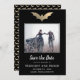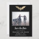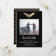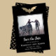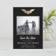 Eine wunderschöne Folienfledermaus hebt diese Save the Date Karte hervor. Der Hintergrund ist schwarz mit passendem goldenen Fledermausmuster. Ideal für eine Gothehohe oder ein Halloween Hochzeitsfest.
