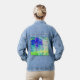 Cette veste en denim dispose d'un ensemble de fleurs violettes bleues assis sur un arrière - plan abstrait dans les tons lavande, vert, violet et les tons de bleu.