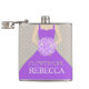 Élégante fille de fleur graphique dans une robe violette riche en tenant une poitrine de violet lilas stylisé rose flacon de hanche mariage. Lit Flower girl Rebecca. Personnalisez avec votre nom et votre titre. Une excellente idée cadeau pour les douches nuptiales, les soirées de poule ou les répétitions mariages.