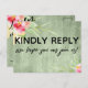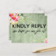 Le dos et l'avant étaient agrémentés de jolies fleurs colorées d'aquarelle. Dans le texte modifiable "gentiment répondre" a été placé, grand et gras, sur le devant. Dans une écriture décontractée moderne, un graphique représentant "Nous espérons que vous pouvez vous joindre à nous !" apparaît ci-dessous. Au dos, la même police unique a été utilisée pour créer des graphiques qui lisent "rsvp", "m", "gentiment livrer à :" et "choix de menu pour chaque invité :" Tous les autres textes sont modifiables. Utilisez les champs modèle pour personnaliser autant que vous le souhaitez. L'arrière - plan est recouvert d'images rustiques en bois vert. // 100 //