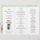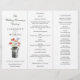 Programme de mariage triplé avec un bouquet rustique aquarelle de fleurs cueillies à la main dans un seau de lait. À l'arrière du programme, il y a un arrière - plan vert de lavage d'aquarelle d'été avec un pré de fleurs, floral comme des pavots, des fleurs de maïs et de l'herbe. Remarque : la modification du type de papier peut rendre le programme difficile à plier.