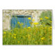 Fleurs d'aquarelle jaune en fleurs avec porte en bois bleu et mur en pierre