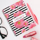 Belle conception de planneur en spirale personnalisée avec des fleurs de Gerbera roses sur un motif rayé noir et blanc. Le texte est entièrement personnalisable.