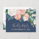 Cette carte postale RSVP romantique à fleurs de pivoine bleu menu choix est parfaite pour un mariage élégant. Le design floral présente des fleurs d'aquarelle rose pâle, pêche et blanche en cascade sur un arrière - plan bleu marine. Cette carte postale de réponse mariage demande à la clientèle quel repas elle souhaite à la réception.