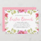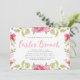 L'élégante invitation au brunch de Pâques présente une bordure florale d'aquarelle avec des touches de rose, de violet et de vert. L'invitation brunch dispose également d'une police de script élégante, d'espaces réservés pour vos informations personnalisées, et d'un motif de pois rose et blanc à l'arrière.