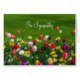 Bordure fleurie printanière remplie de tulipes et de narcisse avec une pelouse verte luxuriante. Ouvrez pour votre propre message de condoléances. Entièrement personnalisable.