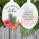 Premier ornement de Noël avec un design hawaïen d'ananas et de fleurs tropicales. Forme ovale avec libellé personnalisé à l'avant et à l'arrière. Faites-en un "premier Noël dans notre nouvelle maison" ou "Noël marié" avec les noms sur le devant et l'adresse sur le dos.