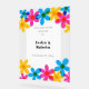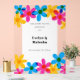 Cette enseigne mariage acrylique personnalisée offre un style rétro moderne avec des fleurs de marguerite hippie en jaune vif, bleu et rose magenta. Les graphismes dessinés à la main sont conçus pour imiter l'impression de style risographe classique. Vos détails personnalisés apparaissent dans une simple impression noire contre un arrière - plan blanc propre.