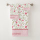 Monogrammez ce joli ensemble de serviettes de bain fleuri rose et vert. L'ensemble comprend une serviette de bain, une serviette de toilette et un gant de toilette. Un beau cadeau de mariage ou un cadeau de douche nuptiale ou achetez-en un pour vous-même pour égayer votre propre salle de bain.