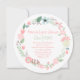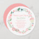 Cette invitation à la remise des diplômes a une esthétique féminine et charmante, dominée par une délicate couronne circulaire florale. La couronne est remplie de fleurs aux couleurs pastel, dont des roses et des tulipes, complétées par des feuilles verts doux. Les couleurs sont douces, rose, vert et bleu, créant une palette harmonieuse et accueillante. Le texte de la couronne est composé de deux polices : une police manuscrite en rose pour le nom, et une police serif classique en vert pour les autres détails. Le design général est frais et festif.