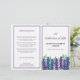 Programme funéraire floral en blanc avec fontes violettes foncées, verdure, fleurs bleues et violettes. Sur le dos vous pouvez écrire la nécrologie et le programme. Pliez-le vous-même pour un programme pratique.